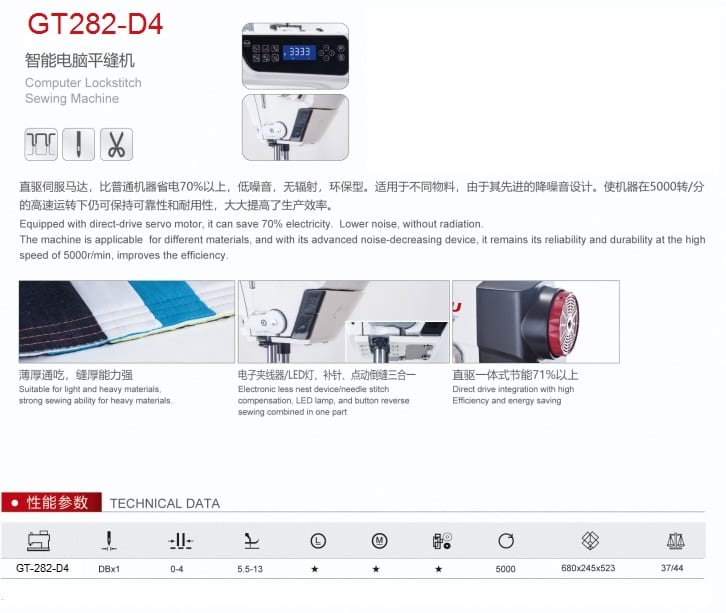GT-282-D4 Máy 1 kim điện tử, nhấc chân vịt tự động SKU: Warranty: 12 months Price: Contact Download: Description Application Video Photo Computer Lockstitch Sewing Machine Others Products GK-8450 Máy 2 kim di động điện tử Price: Contact GK-8420 Máy 2 kim cố định điện tử Price: Contact GK-787-N600 Máy viền túm xén trái điện tử Price: Contact GK-787-R600 Máy viền túm xén phải điện tử Price: Contact GK-781F . Máy thùa khuy áo Price: Contact GK-288E2. Máy 1 kim điện tử Price: Contact GT-900D-5H . Máy vắt sổ, motor đồng trục Price: Contact GT-900D-4 . Máy vắt sổ, motor đồng trục Price: Contact GK-1404P-D. Máy 4 kim móc xích Price: Contact